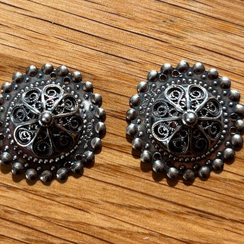 Dobble mansjettknapper i filigran kan brukes til flere bunadsskjorter til bunader beltestakken, Telemarksbunaden og Agderbunaden. Bunadssølvet er håndlaget av gullsmed fra Setesdalen. Stemplet 830 S med ansvarsmerke J.T.R. Som står for Jon T. Rysstad. Hvitt sølv. Ca. Diameter på knappene er for den største 1,8 cm. og 1,4 cm. på den minste knappen. Knappene har bunn. Bunadsknappene blir pakket for sikker transport.