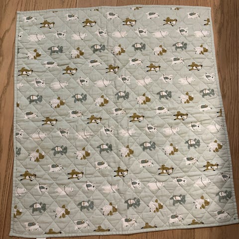 Quiltet leketeppe perfekt for babyer. Tosidig, beige og blå småblomstret.