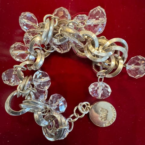 Metallringer i lag og en stor hjerte med flere charms.