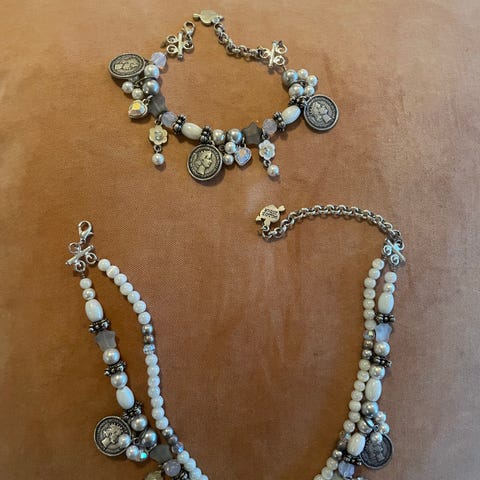 Halskjede i sølv farge med grå " perler " og tilvarende armbånd .