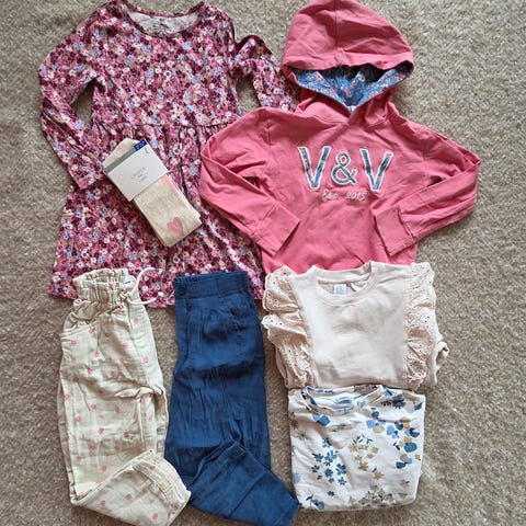 Fin klespakke bestående av 3 gensere (den lilla er ubrukt, den fra Hust&Claire er noe mer brukt med litt nupper), 1 leggings, 1 bukse med vide ben, og 2 topper.