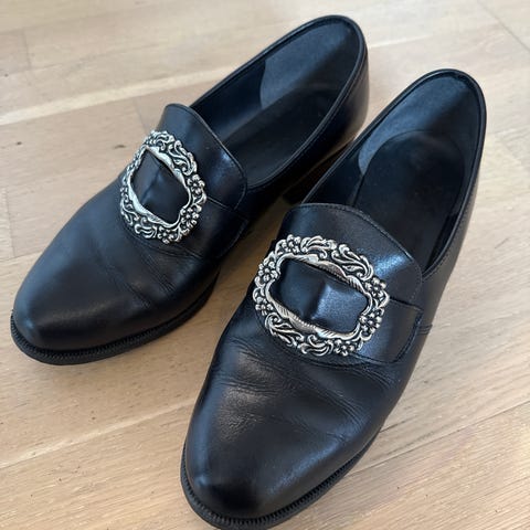 Klassiske, svarte bunadssko i skinn. Berre brukt nokre få gonger og i veldig fin stand. Dei er i produsenten sin str. 5, som eg vil tru tilsvarar str. 37,5. Dei er i alle fall veldig trange til meg, som til vanleg bruker str. 38-39 (derav den sparsame bruken). Hælen er 3,5cm.
