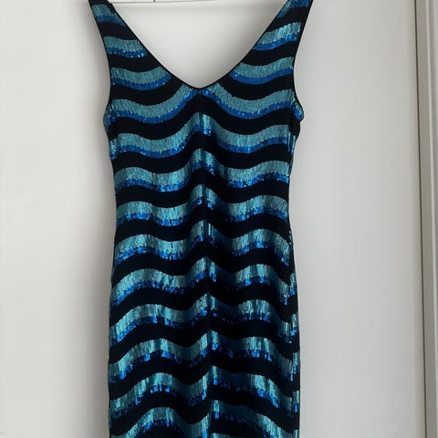 Selger en blå topp i størrelse XS med mørkeblå mønster. Den har et stretchy materiale og er laget av 100% Bomull. Toppen er helt ubrukt og i ny stand.