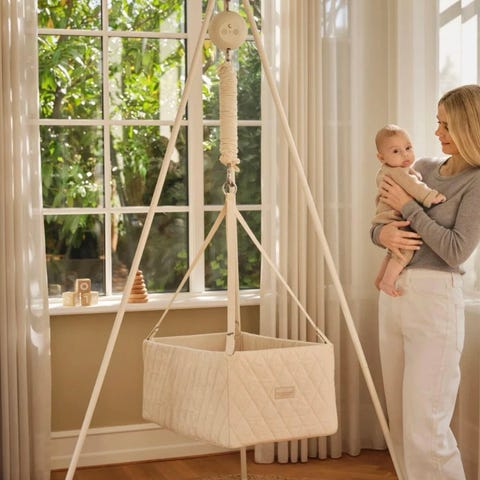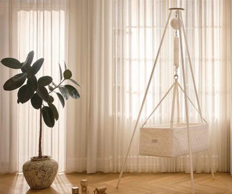 Romslig og GOTS-sertifisert vugge med oval form og flat bunn leies ut. Myke bevegelser fra vuggemotoren og et praktisk og stilrent stativ. Versjon 2.0.