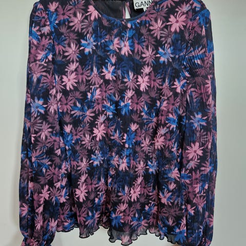 Denne er kun brukt en gang og fin som ny 🤩 Søt topp/bluse i tynt, behagelig og litt glinsende viskosestoff, med flatterende vaffelsøm og litt utsvingt kant nederst og på ermene. Liten åpning i nakken med knapp. Fargerikt, pent mønster i rosa/lilla/brun/hvit på svart bakgrunn. Et fint plagg til vårens selskapeligheter 💕☺️ Merke: Kaffe, str 44.