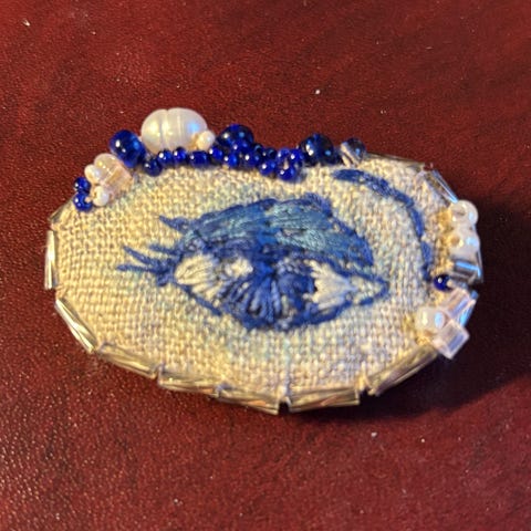 Brosje i stoff i lilla farge, 11cm diameter, kr 50,-