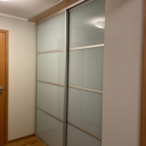 2 stk skyvedører og listene til skyvedører selges. Den ene er hvit (på bildet), det andre er et glassdør (demontert). Ingen skader i glasset eller på den andre døren. Virker som det skal.