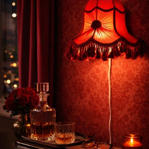 Retro / Vintage Rød oransj bordlampe med messingsokkel og frynser og varmt rødlig lys