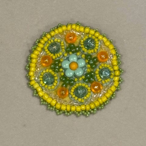 Handlaget Wiola brosje til festdrakt. Heklet, perler og knapper sydd på sort filt. DIameter ca 9 cm.