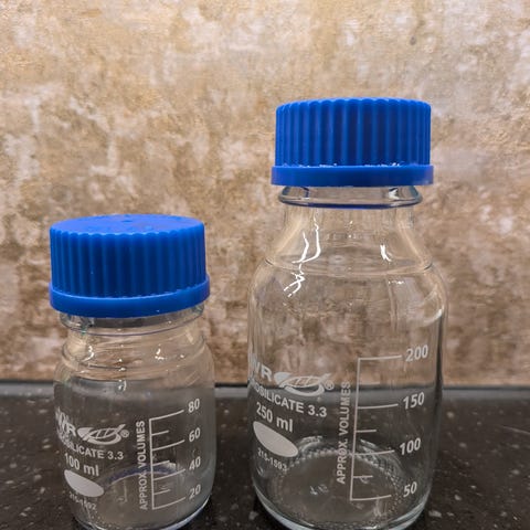 Tre 250ml laboratorieflasker og en liten erlenmeyerkolbe brukt til høsting og dyrking av gjær ifbm ølbrygging.
