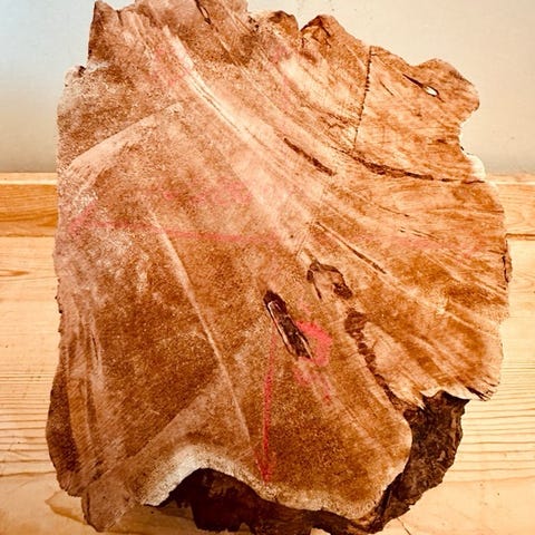 Kåte/risknute av snekkertørr selje. Fin figurering i veden og naturlige sprekker som gir karakter - disse kan ifylles med epoxy eller knust krystall suspendert i superlim. Mål: ~330x115 mm.
