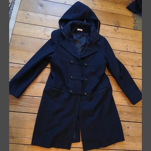 Ekte vintage duffelkåpe i ull av utmerket kvalitet. Lukking i bøffelhorn og skinn med rutete ullfôr.