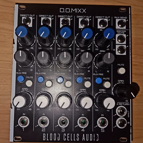 Praga is an expandable four-channel voltage controlled mixer featuring a stereo mixing bus, two auxiliary sends with stereo returns, clickless muting, dedicated modes for unipolar and bipolar voltage control over volume, DC-coupling, and a super-clean signal path obtained via high-quality VCA and opamp chips.