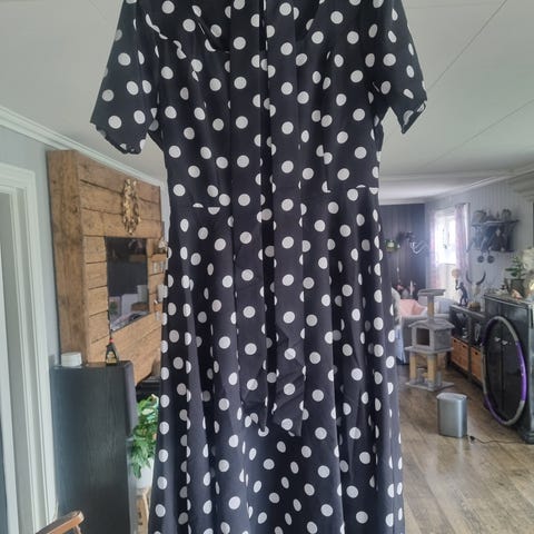 Tynnere, beige, kortarmet, aline, utsvingt, femtitalls, swing, insipirert kjole med svarte prikker, polkadots. Rundhals med sløyfe/knappepynt og mini capsleeves med liten puff. Markert midje og utsvingt skjørt med mye vidde. Glidelås i ryggen. 100% polyester.
