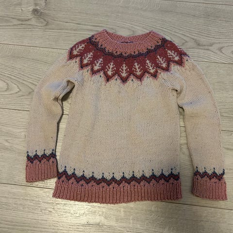 Strikket i Drops Air. Ikke veldig mye brukt. Brukt av jente 12 år, men nå har den blitt for kort. Luftig, myk og varm genser. Garnet stikker ikke!