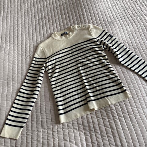 Denne ble raskt for liten og derfor lite brukt, «som ny». Hvis og mørkeblå, delikat strikkegenser med båthals, illustrasjonsbilde lånt fra web.