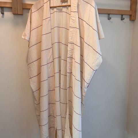 3/4 lange ermer. Nydelig turkis farge. Splitter i sidene. Fine detaljer med snorer og perler. Obs, se bilde av at det har falt av et par perler.