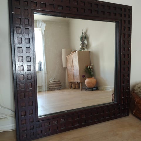 Fint speil med solid treramme, malt i hvit farge. Rammen har en del brukspor, bl.a. i hjørnene (se bilder). Et nytt malingsstøk og speilet blir veldig fint! Må hentes.