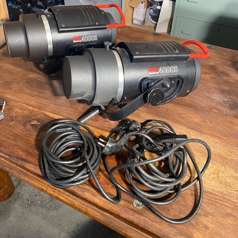 Svært pent (og lite brukt) sett a 2 stk Elinchrom Style 600 RX mono-blitzer m/stativ, 2 x 60 cm softbokser, r2 x paraplyer, 1 x transpostkoffert