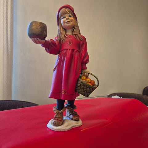 Dekorativ figur av Carl Larsson jente i bunad med spann og bolle hvor man setter stearin lyset.