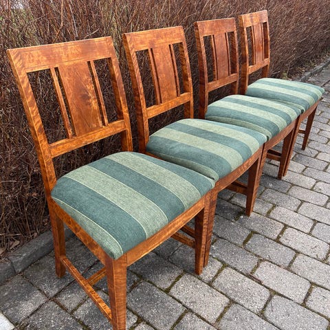 Jeg vurderer å selge 5 antikke bondestoler fra 1800 tallet, de er ekte bondeantikk, låvefunn, med trenagler. Stødige og med original maling. Alle små bruksmerker man kan tenke seg men ingen skader, med krakkelering av malig, de er stort sett urørte. Selges helst samlet for kr 1.250. Ellers kr 400 hver Sittehøyde 40 cm