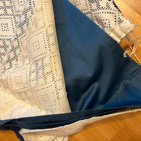 7 fag mellomblå forede gardiner. Litt mønster i stoffet. 4 kapper følger med.