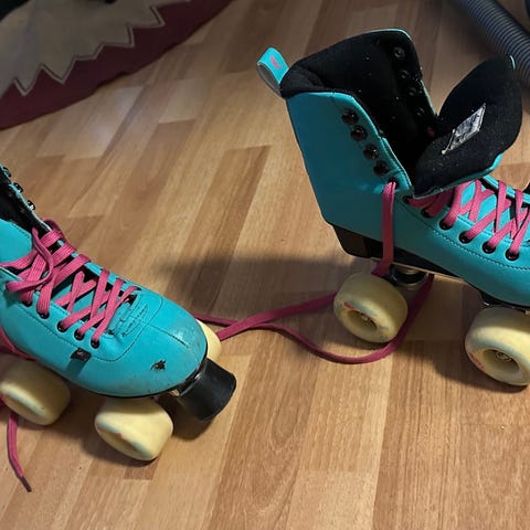 Selger mine pent brukte rullesko. De er brukt, så er noen mindre synlige merker på de, fargen på hjulene har gått litt vekk også. Ellers er skoene behagelige å fine. Skoene er i en fin turkis farge som har glitter i seg.