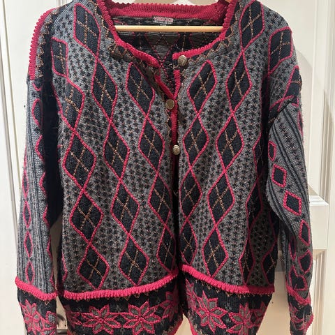 Strikket jakke i norsk mønster med svart vindtett for.