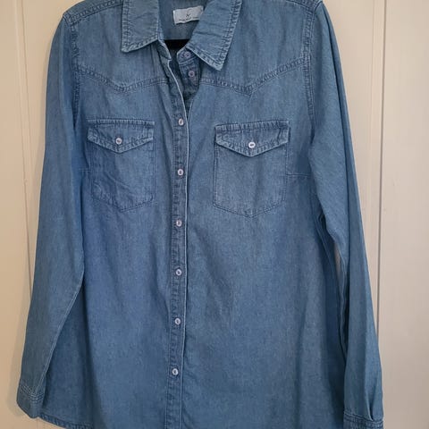 Ola skjorte/bluse med perle knapper. Den skal se litt sånn utvasket noen steder. Pent brukt, lite brukt. Les videre ang henting/sending!