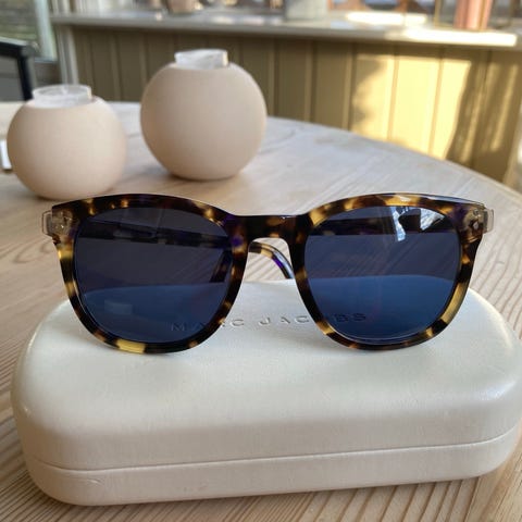Pent brukte Ganni Alice solbriller. Det er ingen synlig slitasje på brillen, men etuiet er gått noe opp i sømmen.
