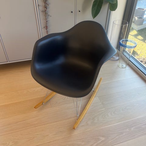 Selger en lekker Eames gyngestol. Komfortabel, lett og passer perfekt inn i moderne hjem – enten som lesestol, i stua eller på barnerommet.