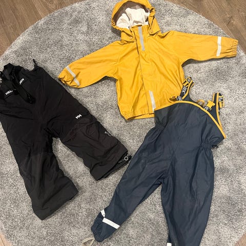 Alle sett er pent brukt (strikken under regnbuksene er noe slitt, men holder fremdeles). Mye bruk igjen.