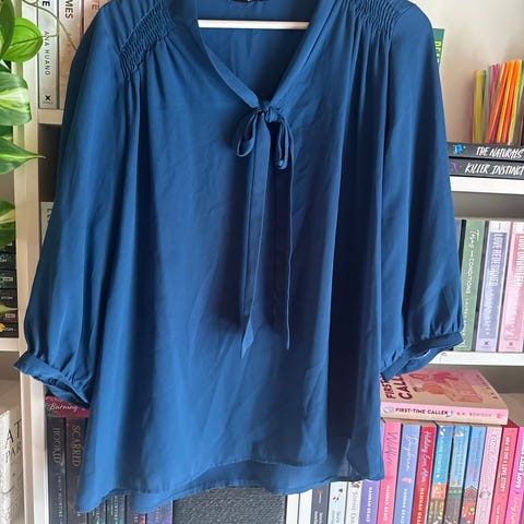 Søt bluse med korte ermer, knapper foran, marineblå med hvite prikker.