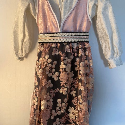 Håndsydd festdrakt str 10 år uten skjorte.. Det er noen nupper på skjørtet på festdrakten. Men, dette kan fjernes med nuppefjerner. Selges kr 350 uten skjorten.
