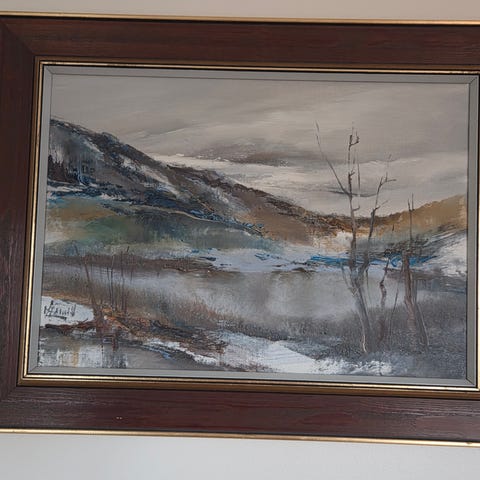 "Første snø (1960)", ant. olje på papir/kartong utyd. sign./datert 1961