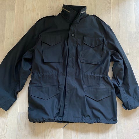 Selger pent brukt svart herrejakke str S, litt baggy modell. Merke Peter Michael.