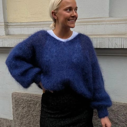 Milana er American Dreams' ikoniske mohairstrikk. Genseren har løse ermer med ribbestrikkede mansjetter, lav skuldersøm, V-hals og en oversized passform.