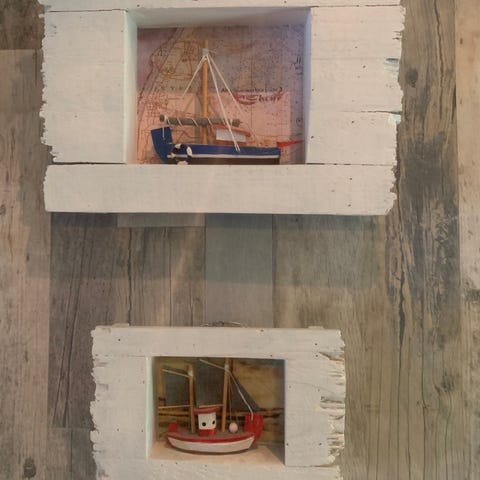 Laget av drivved og brukte riflepatron hylser som er festet på limte treplugger, med cognacglass. Hyllen har rustent håndsmidd pyntebeslag. Flasken følger ikke med