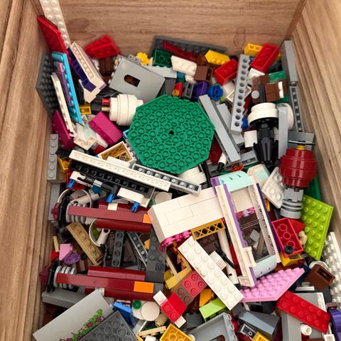 Diverse Lego i en skoeske og en annen boks. Isbil veterinær sabeltannløve ugle bobil brannbil og flere lego-friends-jenter