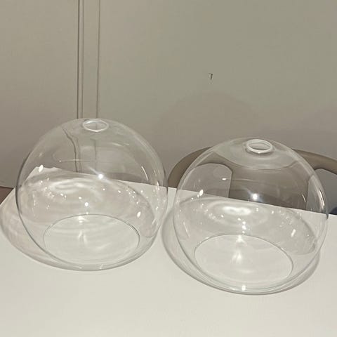 3 stk. skjermer i klart glass (Tellus pendel). En ny, i eske og to som er demontert. 120 kr per stykk eller kr 200 for alle tre. Lyskilder og ledninger følger ikke med.