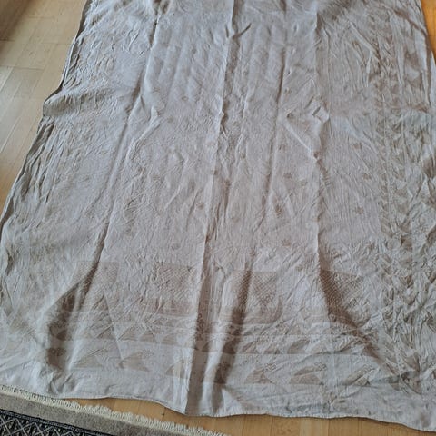 Lysblå 100% vintage lin duk med hvit stripe mønster, usikker hvor gammel den er, har flott lin "patina" trolig fra 1960-70 tallet. Ingen skader, ingen flekker, pent brukt tidligere men ikke i senere år, oppbevart vakuum pose i kald bod. Ikke utsatt for sigarett røyk eller dyrehold. Vasket fin vask nå. Kan hentes Nydalen i Oslo etter avtale eller sendes Fiksferdig.