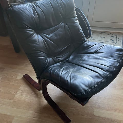 Selger en klassisk, høyrygget lenestol fra slutten av 70-tallet: norsk design Siesta Classic, høyrygget i sort skinn med fotskammel. Ikke mye brukt siste 30 år. Har gjennomgått betydelig renovering: canvas m/sydd forsterkning og nye maljer 2x3stk (NB - sjekk mot andre Siesta Classic stoler til denne pris !) samt ny innfarging sort, skinn er renset og farget (sort innfarging m/Leather Color System fra Industrisøm as.) Fremstår som ny og klar for 30 nye år med nye rumper med behov for ettermiddagsslumring. Fabrikat: LK Hjelle, Designer: Ingmar Relling. Dybde oppgitt er lengde m/fotskammel. NY PRIS 2026, ferdig trutta. Merk: den er RENOVERT !