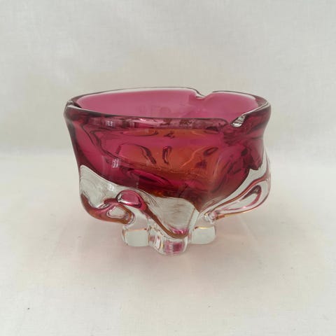 Flott, munn blåst bolle fra Hallingglass. Glass bolle er i klart glass med dekor i fargene rosa, brun, lilla og hvit farge. Med luftbobler, designet av Odd Ingar Karlengen for Hallingglass på 1980 - 90 tallet. Signert under, Hallingglass. O.I Karlangen, Norway. Noe bruksmerker vil du finne.