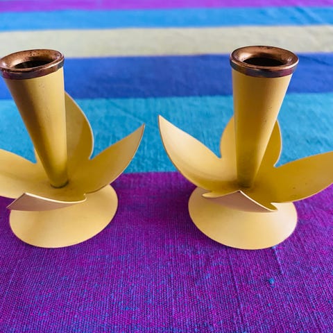 2 stk lysestaker i sort metall og med messingring. Til tynne/smale lys.