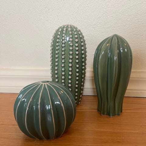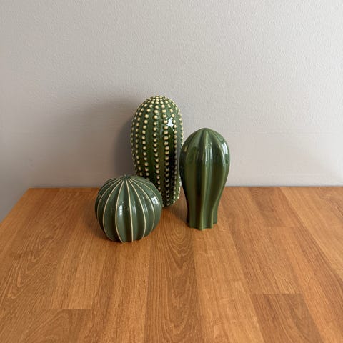 SJÄLSLIGT, Dekorasjonssett, 3 stk., grønne kaktuser, pyntegjenstander av keramikk.