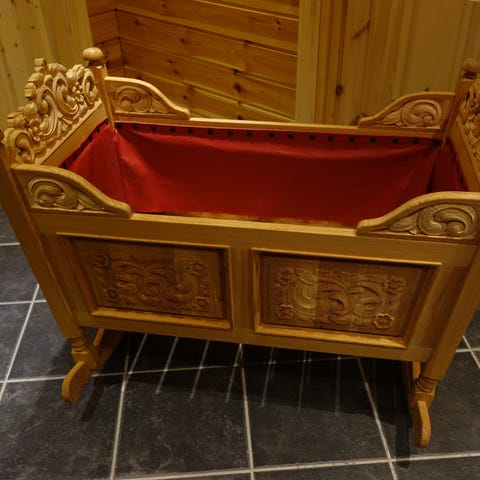 Unik håndlaget vugge i bambus og tre, madrass og 2 formsydde nydelige laken følger med.