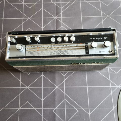 Dette er nok den mest sjeldne av Kurer modellene.Produsert fra 1969 til ca.1975.Den har bare FM,men den har et veldig godt FM mottak.Radioen virker utmerket,men den mangler batterilokk og har en skadet spile i treverket.Denne har produksjonsnr.1559417,som tilsier tidlig produksjon.Selges høystbydende over kr.1000,-
