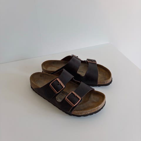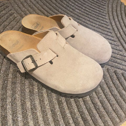 Pensko med reim og en superstødig, høy hæl. Lett avrundet tupp og i imitert semsket skinn i en fin grønnfarge.