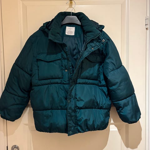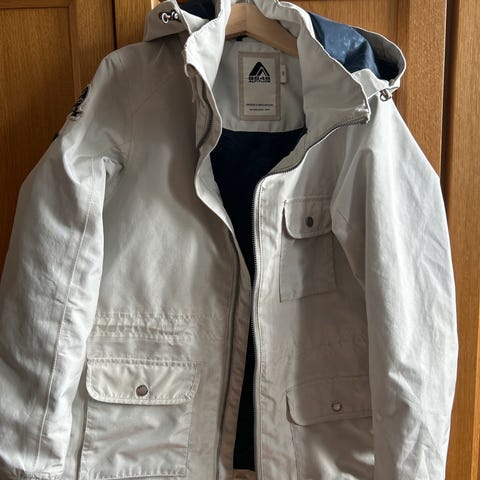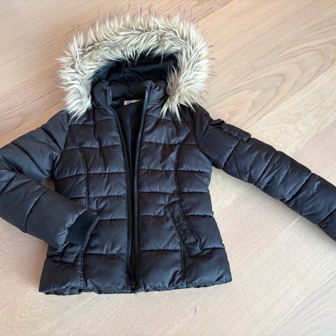 Vattert vinterjakke m fast hette. Teddyfor på hette og øvre del av ryggen. Godt brukt, en søm har raknet ved hetta, kan enkelt sys igjen. Jakka burde holde et par sesonger til. Selges til gi bort pris.