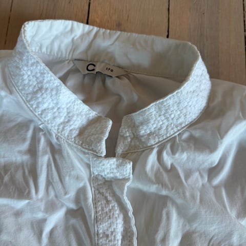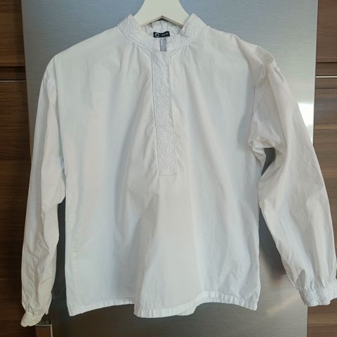 Penskjorte til festdrakt. Pene broderte detaljer på krage, foran på brystet og nederst på ermene. Trykknapper på brystet og pene dekorative mansjettknapper.